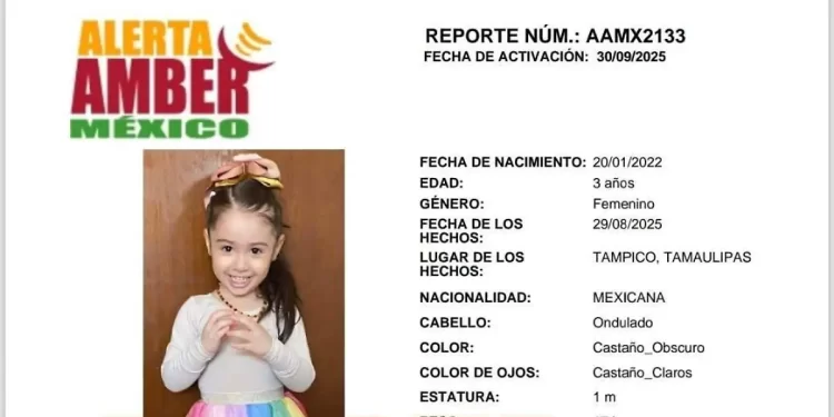 Tampico, Tamaulipas.- La Fiscalía General de Justicia de Tamaulipas activó una Alerta Amber para localizar a Alexa Gabriela, niña de tres años de edad reportada como desaparecida desde el pasado 29 de agosto, cuando fue vista por última vez en compañía de su padre, Alejandro “N”.