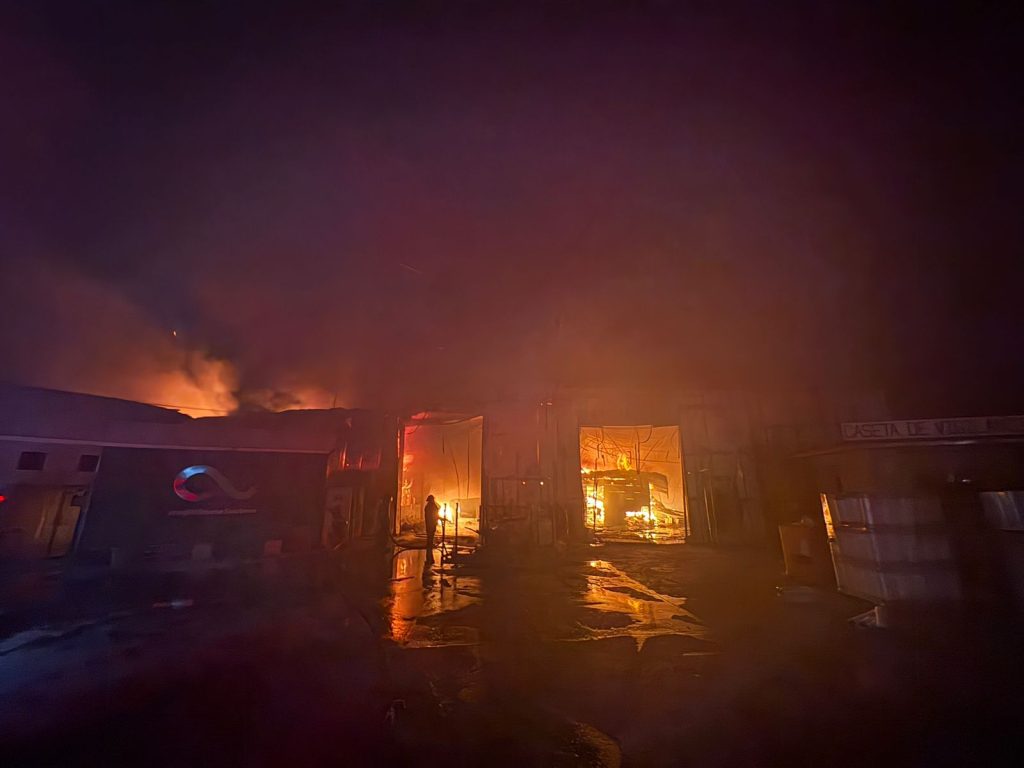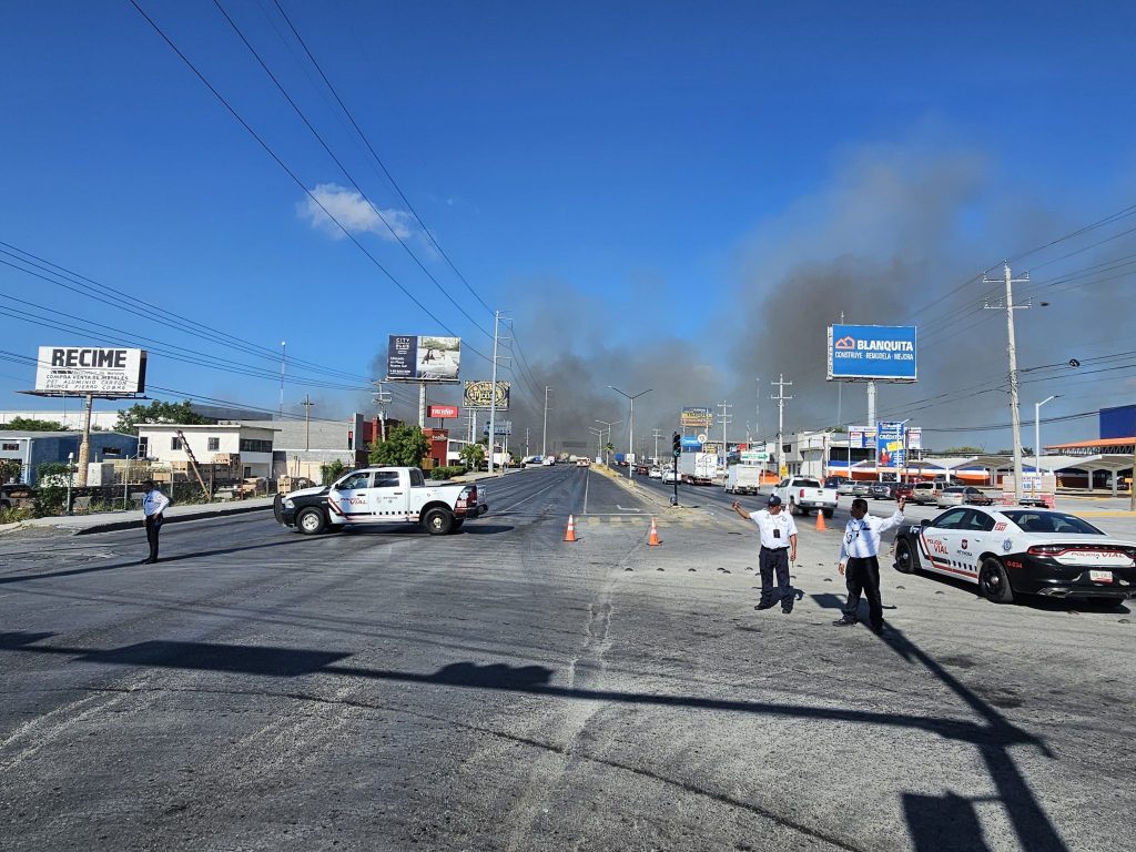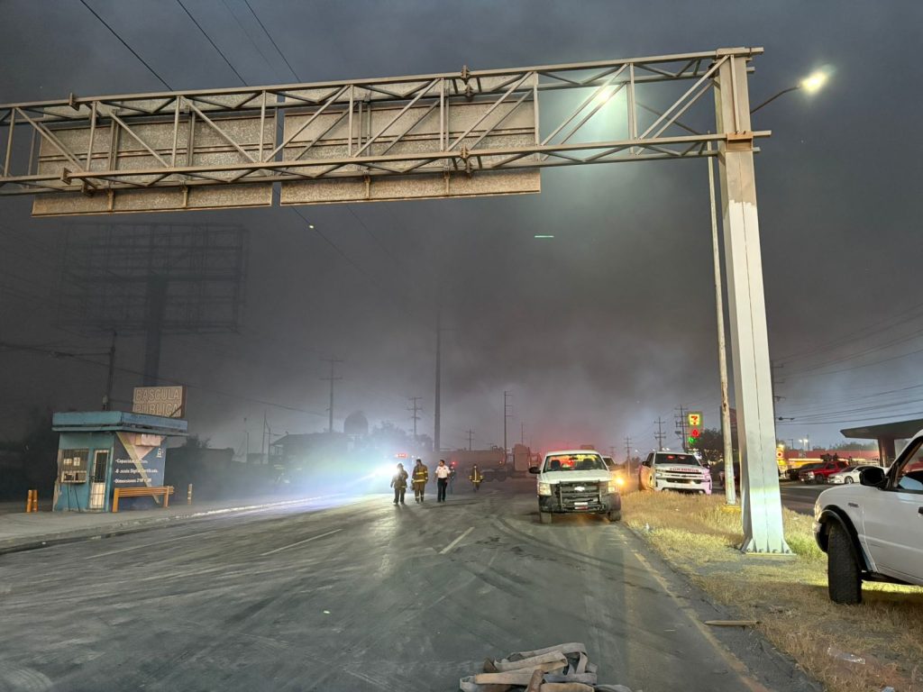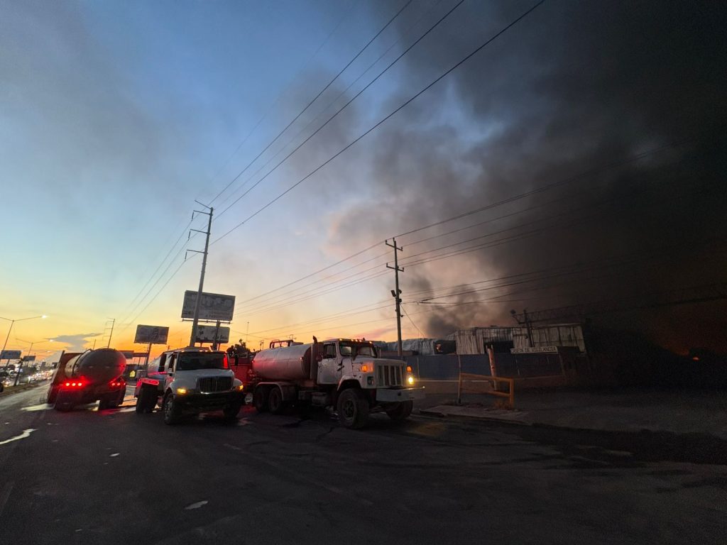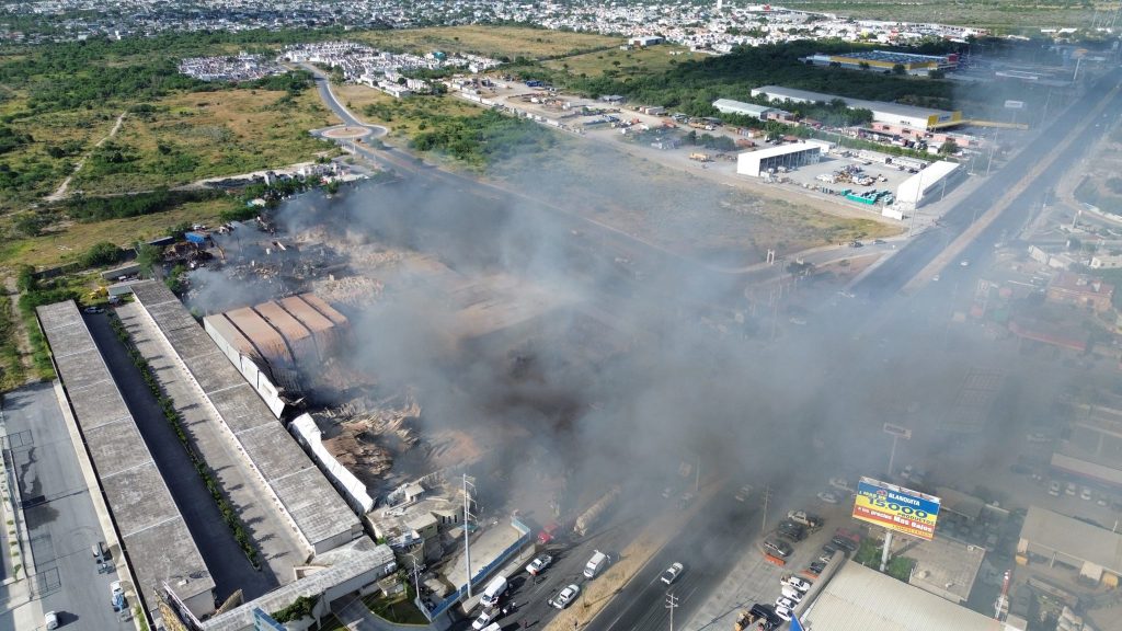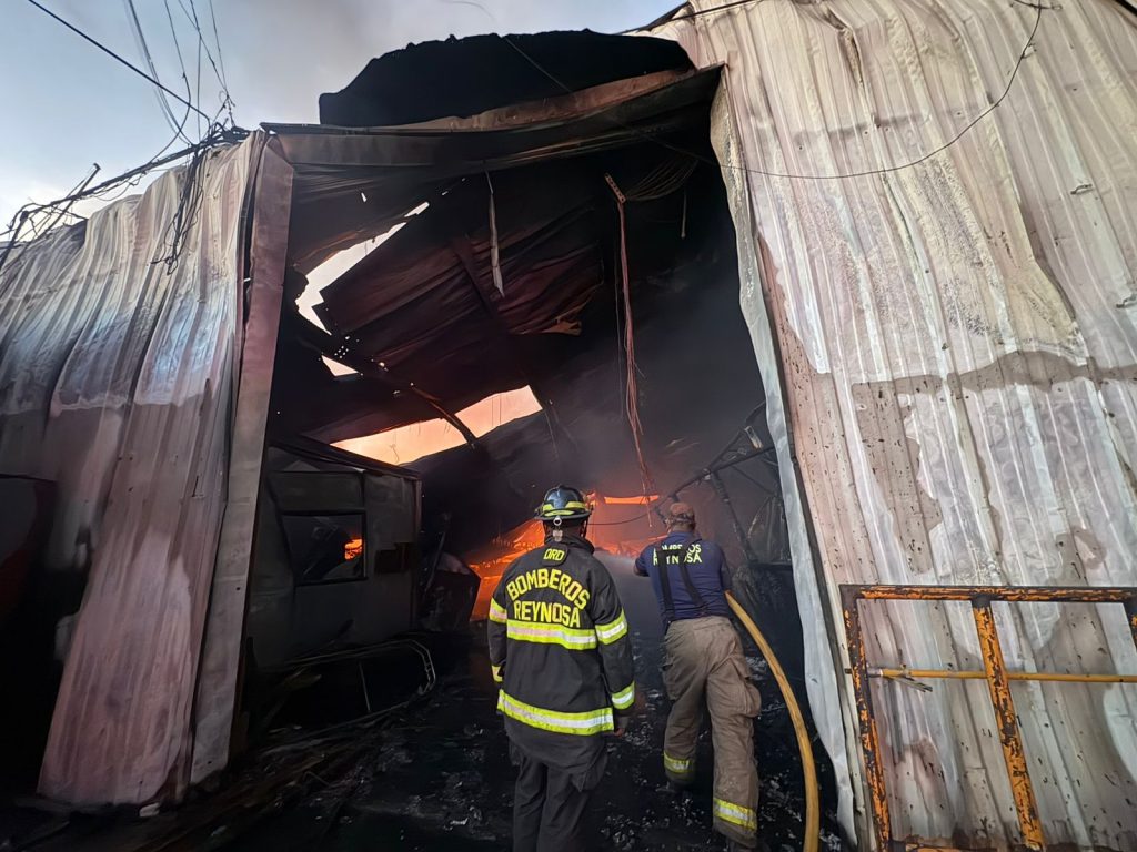 Reynosa, Tamaulipas.- La Coordinación de Protección Civil y Bomberos del Gobierno del Alcalde Carlos Peña Ortiz, atendió un incendio de alto riesgo en una recicladora ubicada en la autopista de salida a Monterrey a la altura de la colonia Esfuerzo Nacional, de donde familias fueron evacuadas para evitar exposición a humo y vapores.