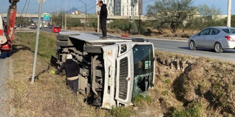 Apodaca, Nuevo León.- Un camión de transporte de personal y un automóvil cayeron a un canal la mañana de este jueves sobre la avenida Teléfonos, cerca de Miguel Alemán, dejando un saldo de 16 personas lesionadas, de las cuales siete requirieron traslado a distintos hospitales.