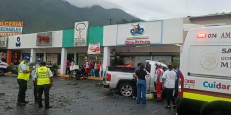 Monterrey, Nuevo León.- La tarde del martes, un conductor perdió el control de su camioneta en la colonia Lomas Mederos y provocó un aparatoso accidente en el estacionamiento de una plaza comercial, donde impactó al menos tres autos, derribó un árbol y se estrelló contra la fachada del restaurante “Mariscos Don Arturo”.