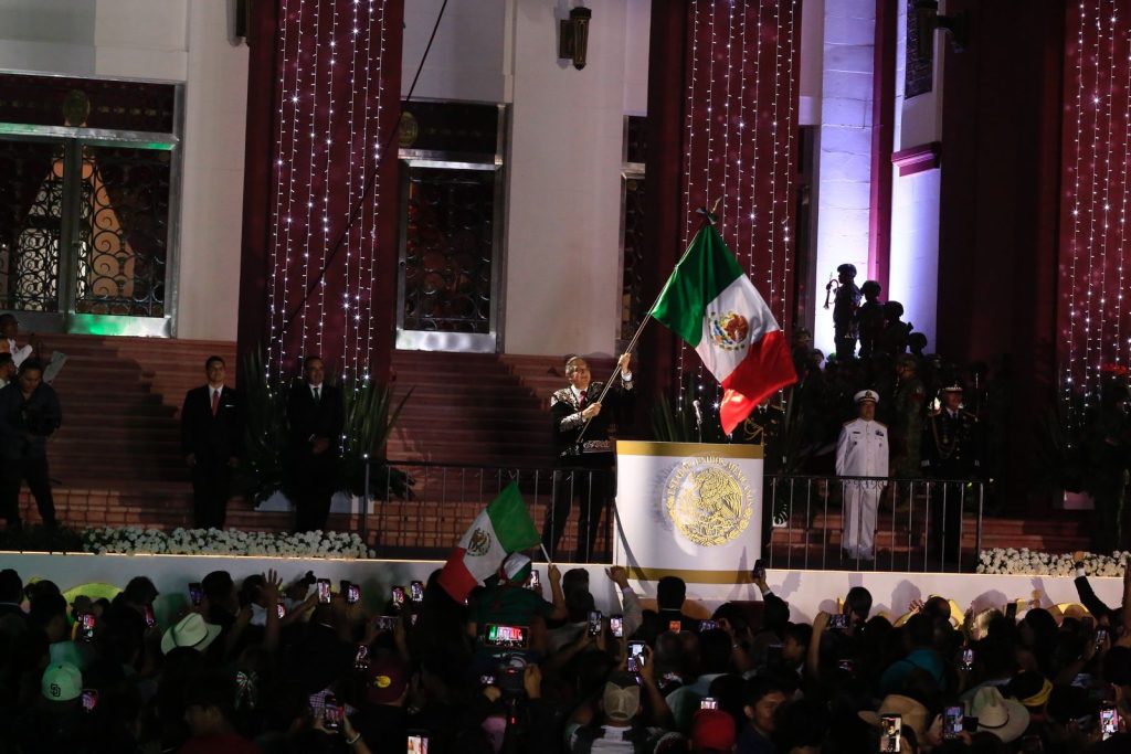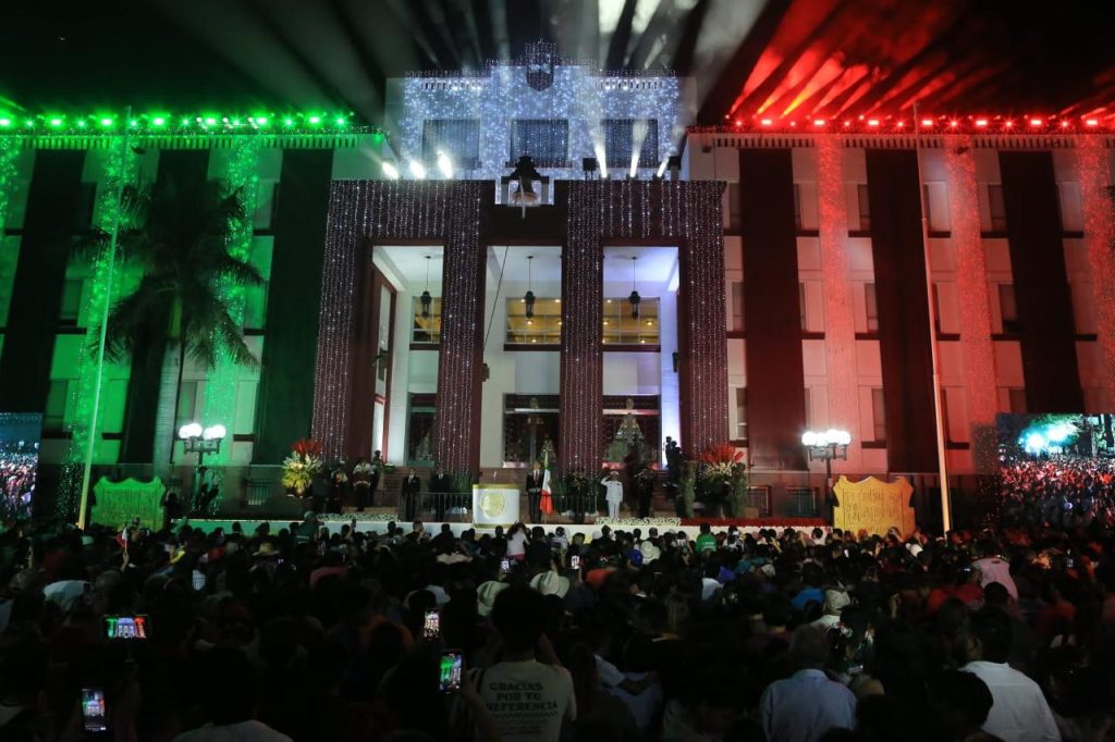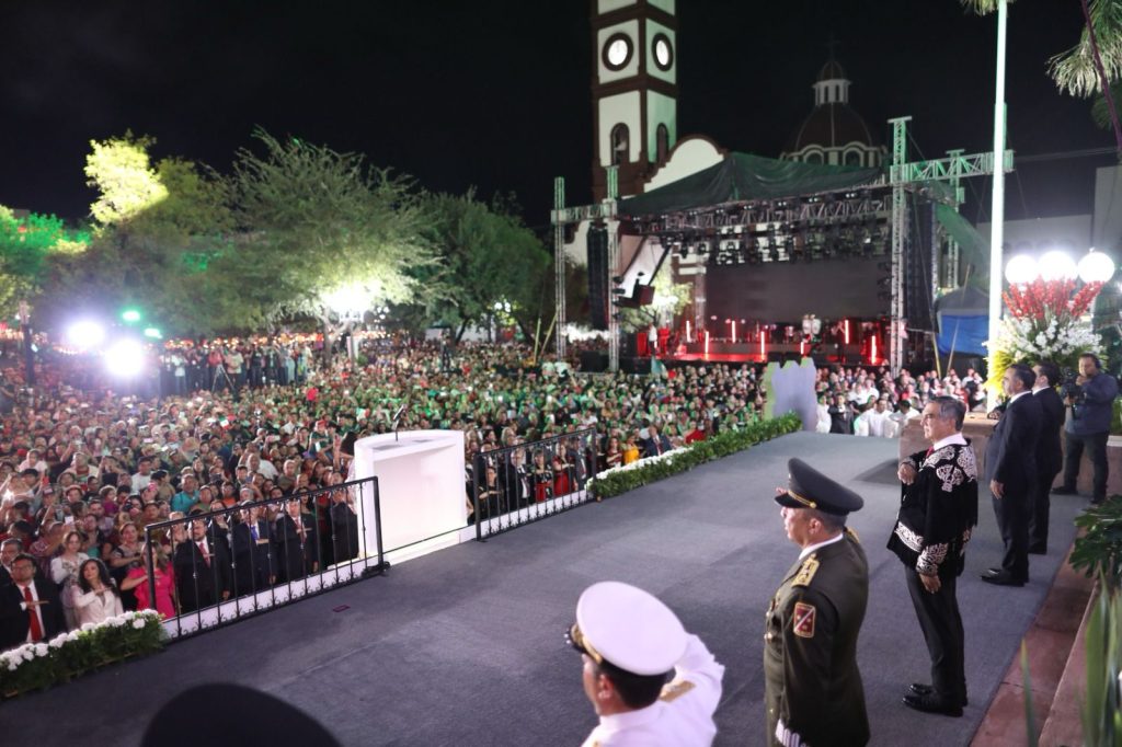 Ciudad Victoria, Tamaulipas.- Miles de familias tamaulipecas se congregaron en la Plaza Juárez de esta capital para conmemorar el 215 aniversario del Grito de Independencia, acto encabezado por el gobernador Américo Villarreal Anaya, quien en su arenga vitoreó a nuestros hermanos y hermanas migrantes, a la honestidad y la justicia, y a los independentistas tamaulipecos.