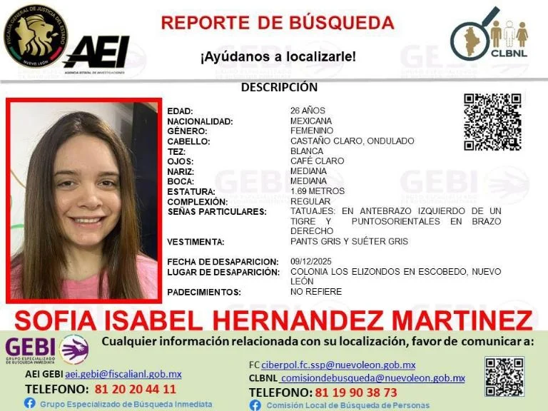 Escobedo, Nuevo León.- Familiares de Sofía Isabel Hernández Martínez, de 26 años, solicitan la colaboración de la ciudadanía para dar con su paradero, luego de que la joven desapareciera el pasado 9 de diciembre en la colonia Los Elizondo.