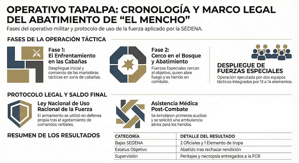 Según el informe oficial, el operativo resultó en la muerte de tres militares —dos oficiales y un elemento de tropa— quienes fueron atacados por el capo y sus escoltas. Trevilla Trejo enfatizó que, tras rodear a Oseguera en el área boscosa, se le conminó a entregarse; sin embargo, el líder del Cártel Jalisco Nueva Generación respondió abriendo fuego, lo que obligó al personal del Ejército a repeler la agresión en apego a la Ley Nacional de Uso Racional de la Fuerza.