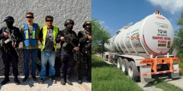 Pesquería, N.L.– Dos hombres fueron detenidos en el municipio de Pesquería durante un operativo contra el robo de hidrocarburos, luego de que autoridades localizaran una pipa conectada a una toma clandestina de Pemex con capacidad para almacenar 52 mil litros de combustible.