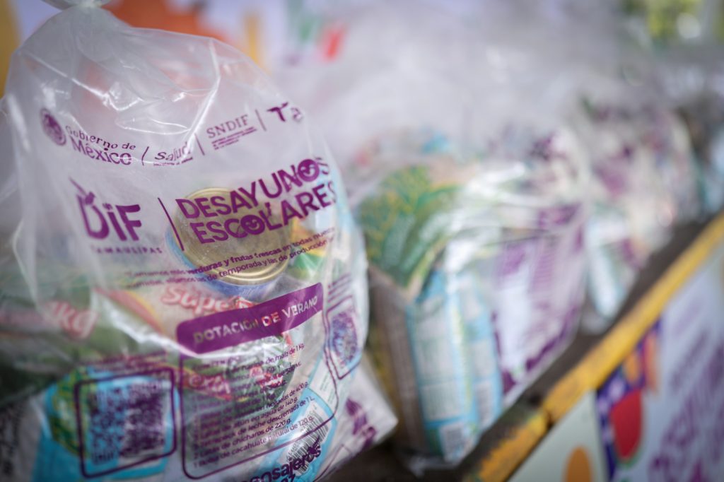 Reynosa, Tamaulipas.- El Sistema DIF Tamaulipas, encabezado por la doctora María de Villarreal, arrancó en Reynosa la entrega de 104 mil 630 dotaciones alimentarias del programa Desayunos Escolares para el periodo vacacional de verano. Los paquetes serán distribuidos en 2 mil 420 escuelas de nivel básico a lo largo de los 43 municipios del estado.