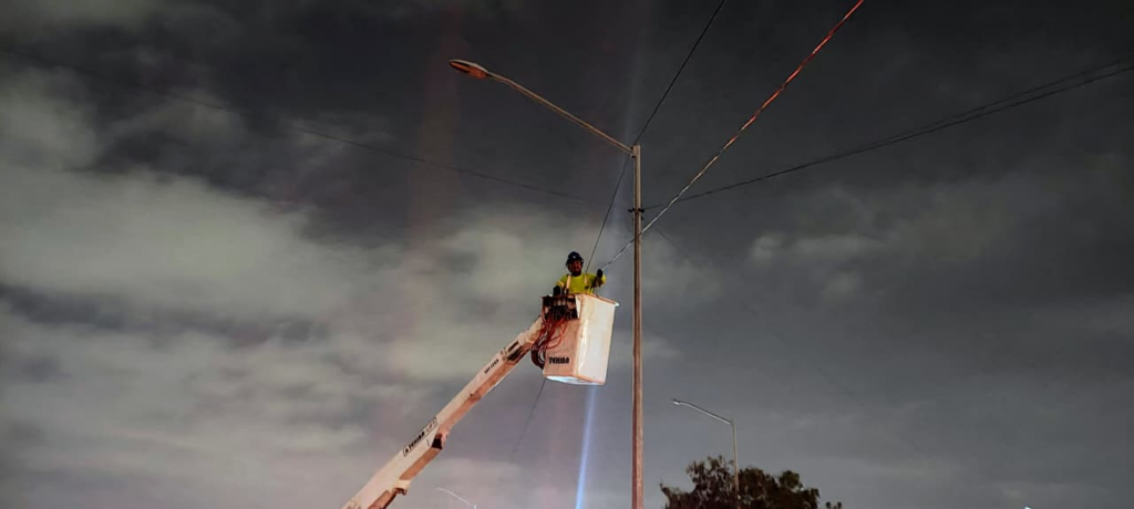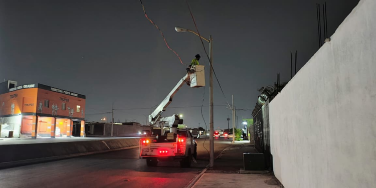 Reynosa, Tamaulipas.— Por instrucciones del Presidente Municipal, Carlos Peña Ortiz, cuadrillas de la Coordinación de Servicios Públicos Primarios llevaron a cabo una jornada intensiva de mantenimiento y modernización del sistema de iluminación en la colonia Hacienda del Sol, como parte del programa permanente de seguridad y mejora urbana en el municipio.