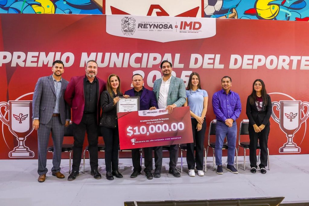 Reynosa, Tamaulipas.- El Alcalde Carlos Peña Ortiz entregó esta tarde el Premio Municipal del Deporte y Premio al Periodismo Deportivo 2025, un galardón que reconoce el esfuerzo, la dedicación, disciplina y honor de los atletas reynosenses y de los periodistas de la ciudad, evento que presidió acompañado por su esposa Alejandra Yelitza Garza, por la Diputada Federal Claudia Alejandra Hernández Sáenz y por el Director del Instituto Municipal del Deporte, Saúl Soto Castro.