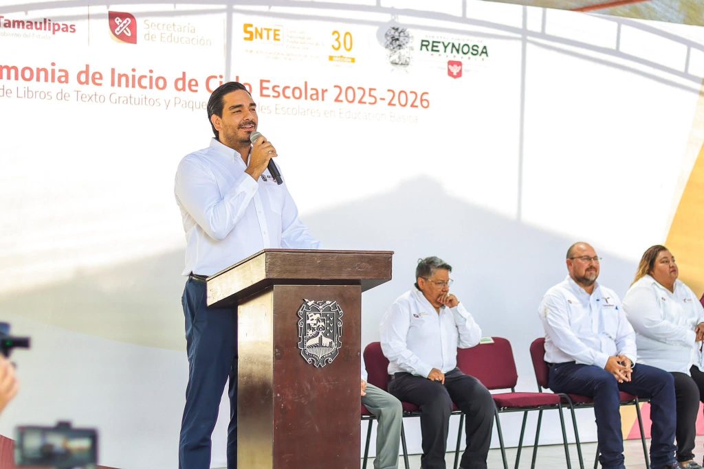 El Alcalde de Reynosa, en presencia de la Directora Gloria Margarita Gámez Zúñiga, destacó: “lo más importante es la educación de la siguiente generación porque esta generación que está aquí ahorita creciendo son los que nos van a poder construir ese México de paz, de oportunidades dignas que hemos soñado y anhelado por ya muchísimo tiempo”.