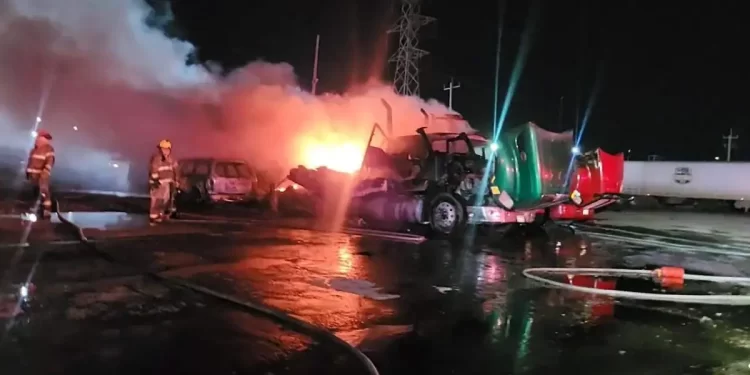 Reynosa, Tamaulipas.- Un incendio de gran magnitud se registró la noche del lunes en un aparcadero de unidades pesadas ubicado en las inmediaciones del puente internacional Reynosa–Pharr. Las llamas consumieron al menos tres tráileres y una camioneta, sin que se reportaran personas lesionadas. La Vocería de Seguridad confirmó el siniestro y recomendó extremar precauciones al circular por la zona.