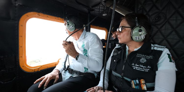 Ciudad Madero, Tamaulipas.- Con el propósito de dar seguimiento a la creciente de los ríos y lagunas en el sur del estado y para supervisar las zonas vulnerables a inundaciones, el gobernador Américo Villarreal Anaya y la coordinadora nacional de Protección Civil, Laura Velázquez Alzúa, realizaron un sobrevuelo y acordaron mantener todas las medidas de prevención y alertamiento.