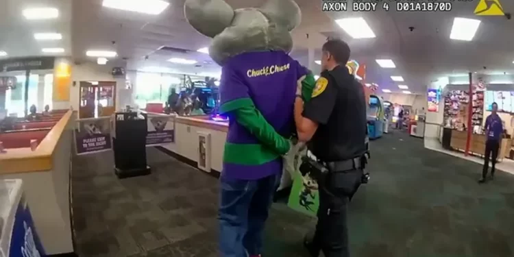 Tallahassee, Florida.- Imágenes de la cámara corporal de la policía muestran a la mascota de Chuck E. Cheese siendo esposada y escoltada fuera del restaurante durante su turno, causando confusión y preocupación entre niños y padres. Una madre en el lugar preguntó a los oficiales: “¿Ustedes esposarían a Mickey Mouse?”