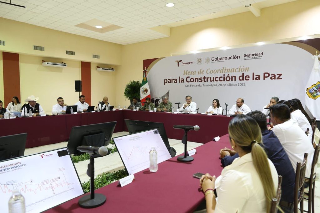 Acompañado por el secretario de Seguridad Pública, Carlos Pancardo Escudero, y la presidenta municipal de San Fernando, Verónica Aguirre de los Santos, así como por las y los alcaldes de Soto la Marina, Jiménez, Burgos, Méndez, Abasolo y San Nicolás, el gobernador presidió en el Centro de Convenciones la Mesa de Coordinación para la Construcción de Paz.