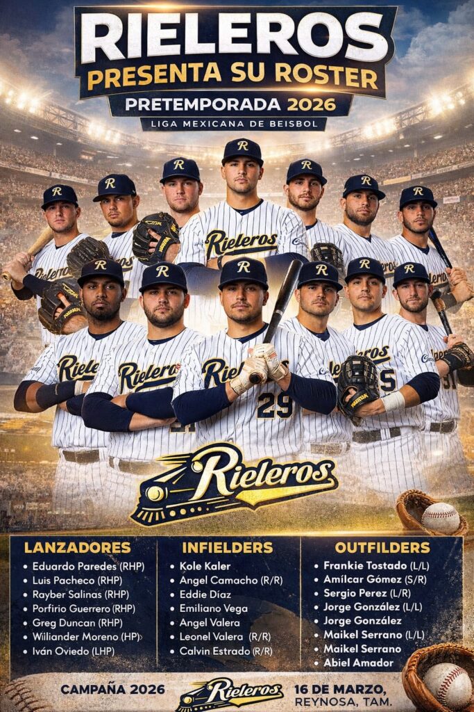 Reynosa, Tamaulipas.- El equipo de los Rieleros de Aguascalientes dio a conocer la lista oficial de jugadores que participarán en su pretemporada 2026, en la que buscarán consolidar una plantilla competitiva rumbo al arranque de la campaña de la Liga Mexicana de Béisbol.